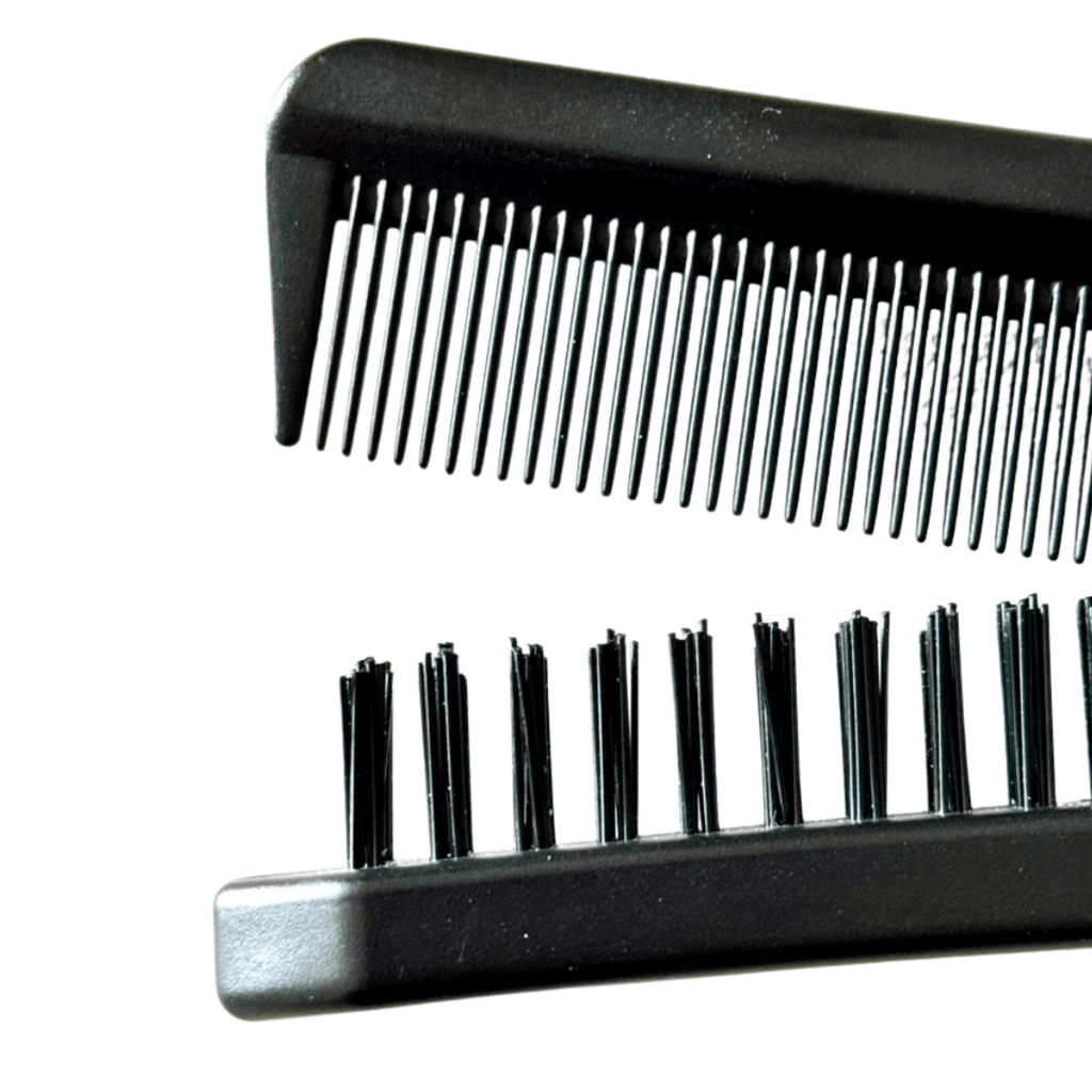 It has a strong pronged comb edge and the other edge is tightly packed nylon bristles. These bristles are firm and get through thicker hair and also can be used to style hair as well.